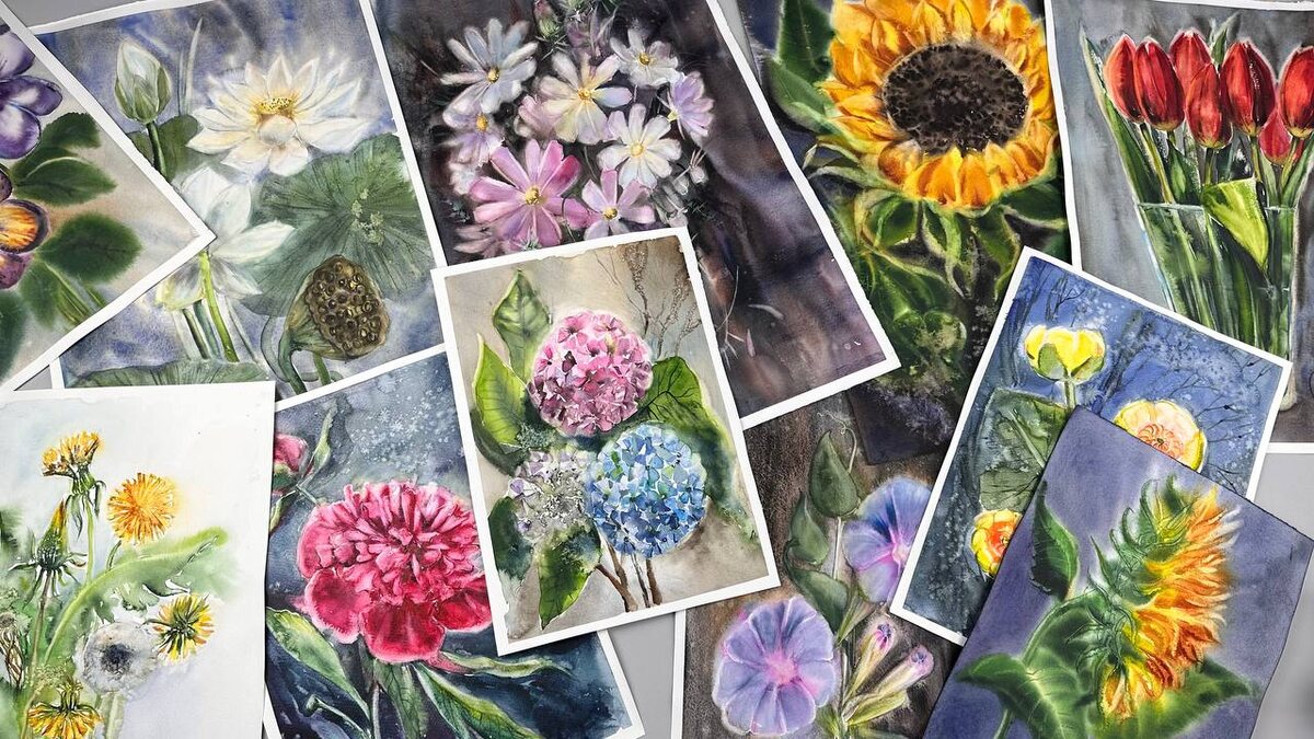 : «у меня получается грязно» И почти всегда за этим стоит не отсутствие вкуса или навыков, а непонимание процесса. Акварель про последовательность и внимание к слоям. Первая ошибка — слишком много правок по сырому. Цвет не успевает «лечь», слои смешиваются раньше времени, и вместо прозрачности появляется тяжесть. Вторая — отсутствие пауз. Акварели нужно время: дать слою высохнуть — значит сохранить чистоту цвета. И третья — попытка сразу работать в мелких деталях, не заложив крупные пятна и тональную основу. Когда меняется порядок действий, меняется и результат. Цвет становится чище, работа — легче, а сам процесс спокойнее. Акварель начинает раскрываться не как сложная техника, а как последовательный, понятный путь, в котором важно не спешить и доверять шагам. Работы с курса по акварели «Цветы акварелью»