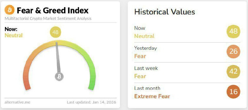 демонстрирует стоимость около 3 300, а основные альткоины увеличились на 5-10% за прошедший день. Индикатор страха и жадности достиг наивысшей точки с октября 2025 года, зафиксировавшись на уровне 48. @Bitcoins-Mining.net