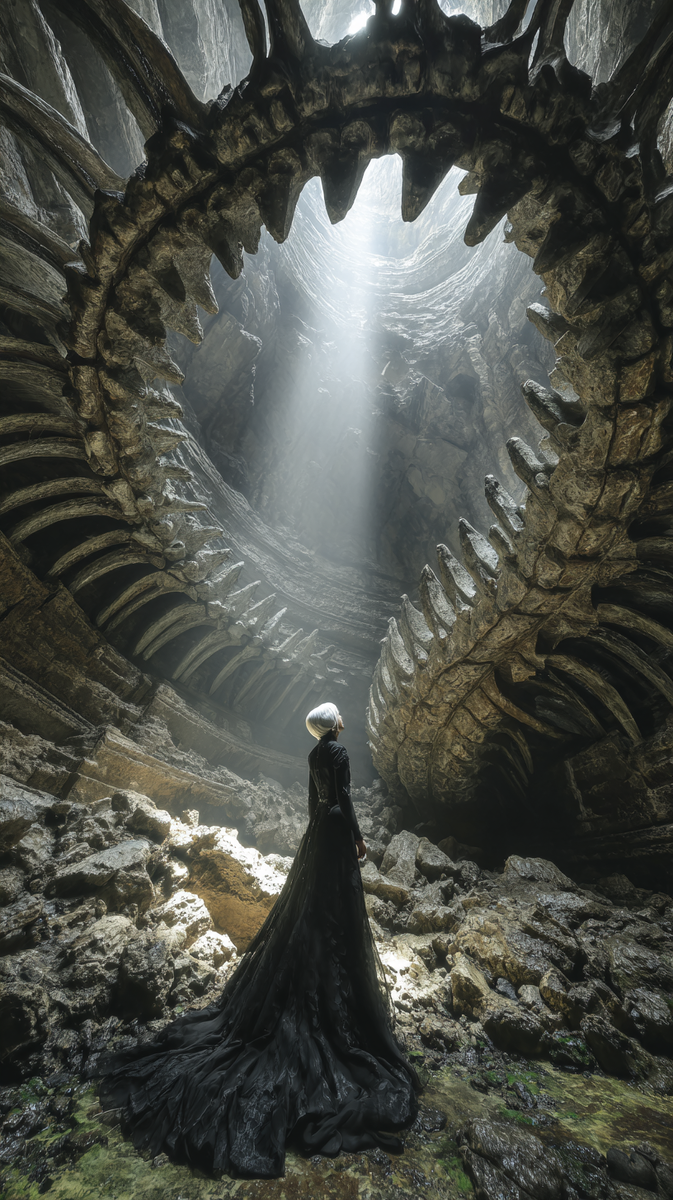 Широкоугольный вертикальный кинематографический снимок крупным планом, объектив 24 мм. Одинокая фигура японской модели стоит в центре колоссальной грудной клетки древнего дракона, которая образует естественную арку собора. На ней длинное струящееся черное платье со шлейфом. Ее головной убор из белой кости выделяется на фоне темноты. На заднем плане видна обширная подземная пустота, заполненная биолюминесцентным туманом. Единственный луч небесного света пробивается сквозь скелетообразный потолок, освещая ее как хранительницу гробницы. Эпический масштаб фэнтези, атмосферный и завораживающий.
