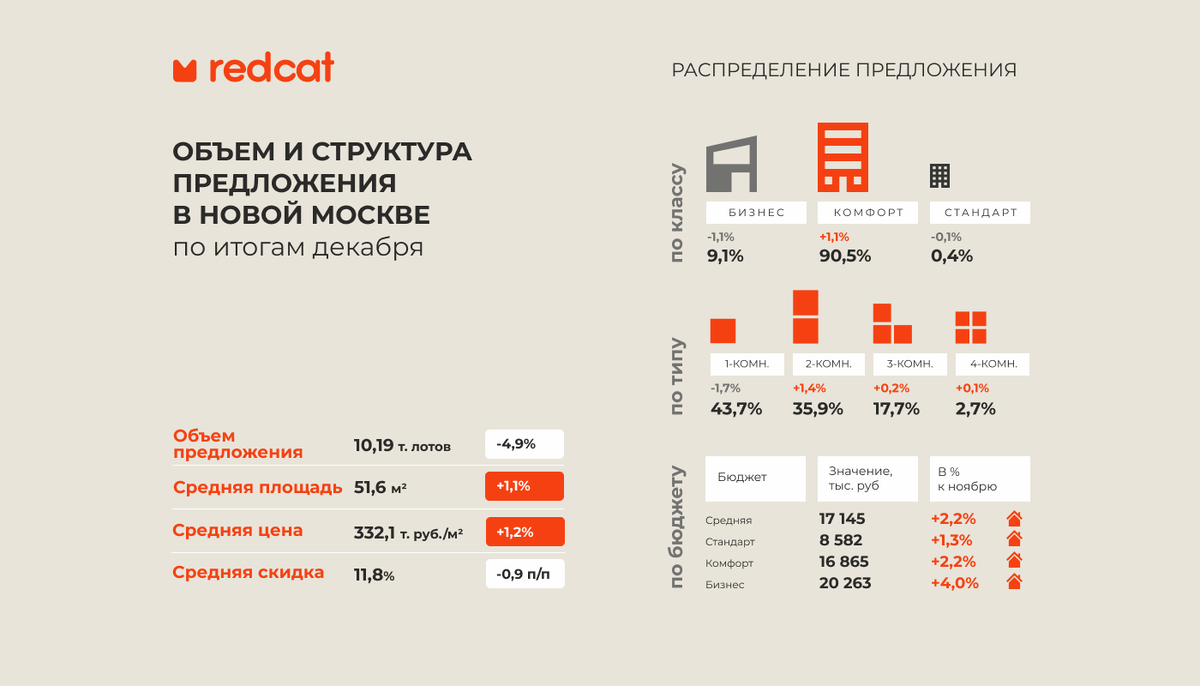 В Новой Москве в декабре на рынок вышли 4 новых корпуса, также предложение пополнялось за счет новых объемов в уже реализуемых проектах. Несмотря на выход новых корпусов, объемы предложения в Новой Москве продолжили снижаться и снова обновили минимальные значения, предыдущий минимум был в январе 2022 года, тогда здесь предлагалось 9,86 тыс. лотов. Общее количество лотов, находящихся в экспозиции в декабре, сократилось на 4,9%, объем предложения зафиксировался на показателе 10,19 тыс. лотов, что уже на 46,2% ниже уровня декабря прошлого года. В структуре предложения по классам в декабре смещение в сторону доступных проектов продолжилось, объемы экспозиции в бизнес-классе по-прежнему сокращаются более активно. Доля квартир бизнес-класса снизилась на 1,1 п/п и составила 9,1%, доля комфорт-класса поднялась на 1,1 п/п до уровня 90,5%, доля стандарт-класса потеряла 0,1 п/п и остановилась на показателе 0,4%. В структуре предложения по количеству комнат отмечен сдвиг в сторону более крупных,