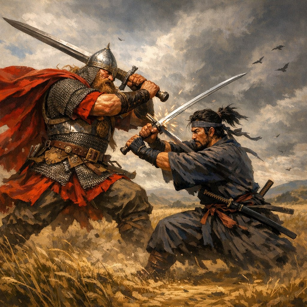 Что произойдет если легендарный русский богатырь сойдется в ожесточенном бою с легендарным японским самураем? Кто из множества прославленных богатырей будет защищать честь Руси от посягательств восточного воина? Наверное выбор падет на самого известного богатыря Илью Муромца. Этот славянский воин и герой множества былин обладает сверхчеловеческой силой, способный сбивать врагов ударом шапки или ломать железные рукояти мечей в руках. А кто из "Страны восходящего солнца" сможет хоть как-то составить конкуренцию "древнерусскому терминатору"? В Японии есть не менее легендарная личность - Миямото Мусаси, виртуозный мастер меча, который побеждал в 60 дуэлях благодаря технике, тактике и психологическому превосходству. В гипотетическом поединке преимущество за Ильёй из-за физической мощи, но бой - это совокупность тысячи случайностей и в нем может произойти что угодно. Илья Муромец — настоящий гигант с невероятной выносливостью: он куёт пудовые стрелы, мастерски владеет булатной палицей и м