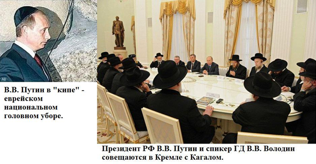 Путин Владимир Владимирович – президент (премьер-министр) РФ. Путин является выдвиженцем еврея Собчака. Чтобы еврей выдвинул не еврея? – нереально. 29.04.2005 г. по каналу "Евроньюс" ("Культура") в 08-03 мск. было показано посещение В.В. Путиным мемориала жертвам "холокоста" в Иерусалиме. Во время этой церемонии на голове В.В. Путина была одета национальная еврейская шапочка - кипа (маленькая круглая шапочка, прикрывающая макушку). Ни один из телеканалов РФ этих кадров не показал. 07.01.2011 г. по телеканалам сообщили в связи с посещением В.В. Путиным села, из которого происходят его родители, что матерью у него является Мария Ивановна Шеломова. Это характерная еврейская фамилия, образованная от еврейского приветствия: «шелом алейхем». Известны, например, еврейские писатели Варлаам Шаломов и Шалом Олейхем. В 2020 г. н.э. во время визита в Израиль выяснилось, что бабушка у В.В. Путина еврейка. В.В. Путин имеет физиологический признак части евреев — отсутствие мочки уха;
