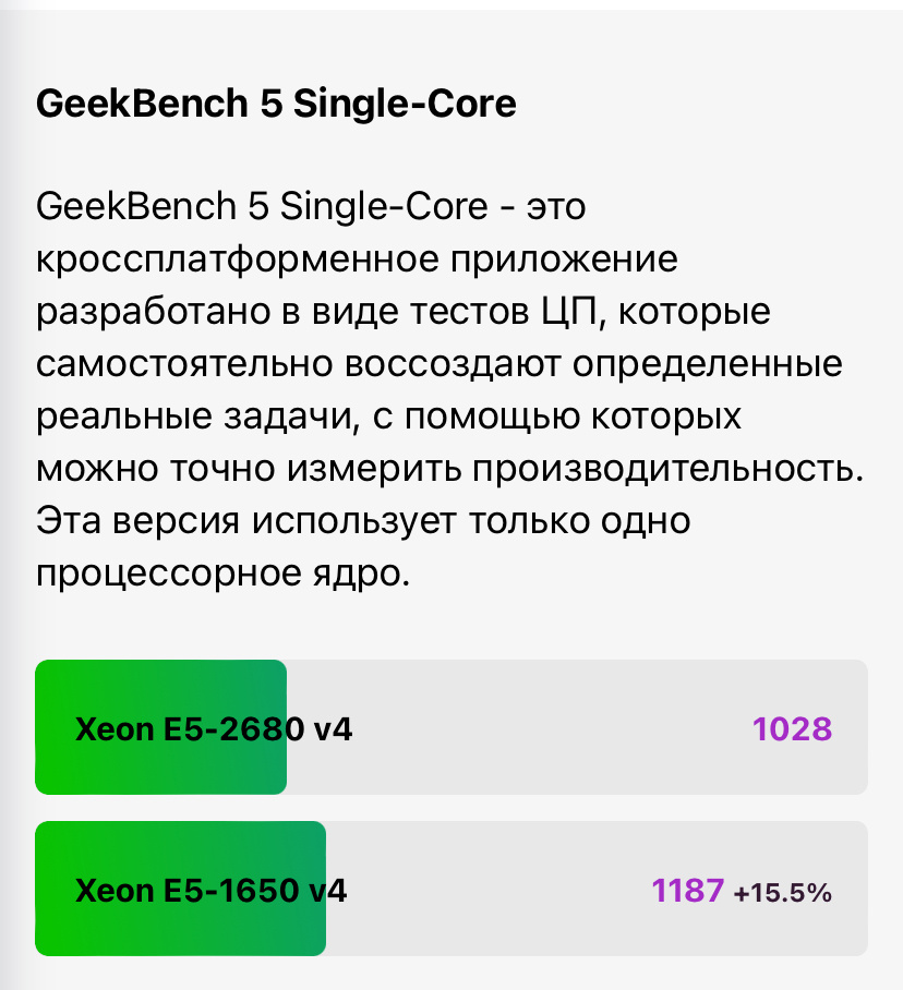 Проведем небольшое сравнение и возьмем для него два CPU: Xeon E5 2680v4 и Xeon E5 1650v4. Xeon 2680v4 имеет 14 ядер и 28 потоков в то время как Xeon 1650v4 имеет всего 6 ядер и 12 потоков на одинаковой архитектуре и казалось бы ни в какое сравнение они не идут, но все не так просто, Xeon 1650v4 имеет преимущество в однопотоке над Xeon 2680v4 и благодаря этому он будет себя показывать лучше в большинстве игр. Но Xeon 2680v4 будет лучше в играх с многопотоком и программах которые требует большое количество ядер, а не их частоту.