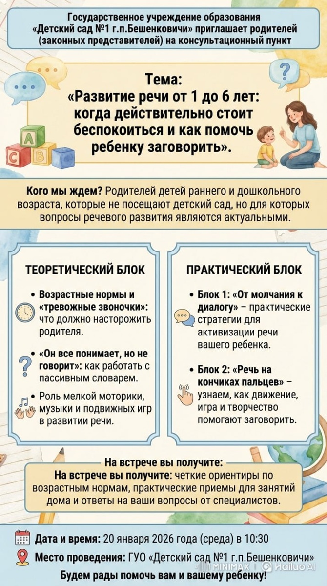 ! 📍20 января на базе детского сада №1 пройдет встреча для мам и пап, которые хотят правильно развивать ребенка дома и нуждаются в помощи профессионалов. ⬆️Подробности в инфографике⤴️