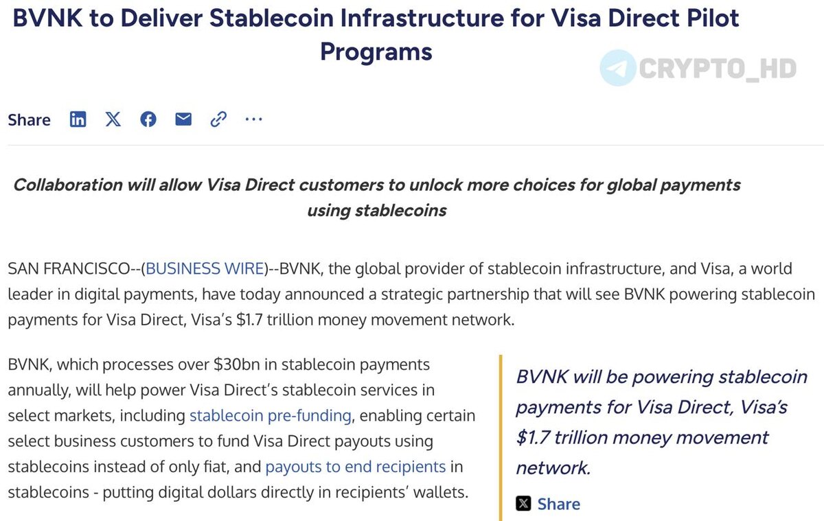 🤝 Visa в партнерстве с BVNK запускает выплаты в стейблкоинах — релиз