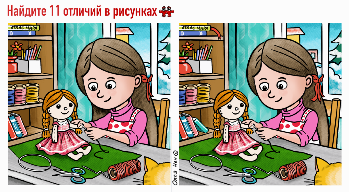 За рукодельницей хозяйкой наш котик может наблюдать часами. Сегодня девочка Аня чинит куклу, а Кеша, подглядывая из под стола охотится за нитками. Где-то на картинках спрятались целых 11 отличий. Все нашлись?