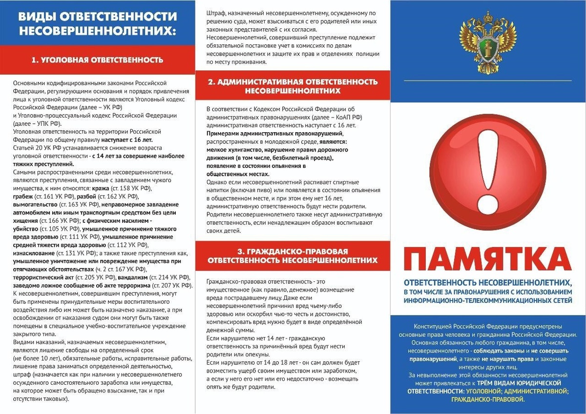 Любой гражданин, в том числе несовершеннолетний, имеет права и обязанности и несёт юридическую ответственность за свои поступки перед государством и другими людьми. Очень часто дети и подростки не осознают всю серьезность преступлений и считают незаконные действия чем-то вроде опасной и захватывающей игры. Но незнание закона не освобождает от ответственности❗️ На законодательном уровне установлены возрастные границы с определением видов ответственности несовершеннолетних и тяжести правонарушения. В расчет принимается паспортный возраст на момент совершения правонарушения. В случае несоблюдения законов и совершения правонарушений несовершеннолетний может быть привлечен к уголовной, административной или гражданско-правовой ответственности. Более подробно смотрите в памятке⤴️ #нарушенияподростков
