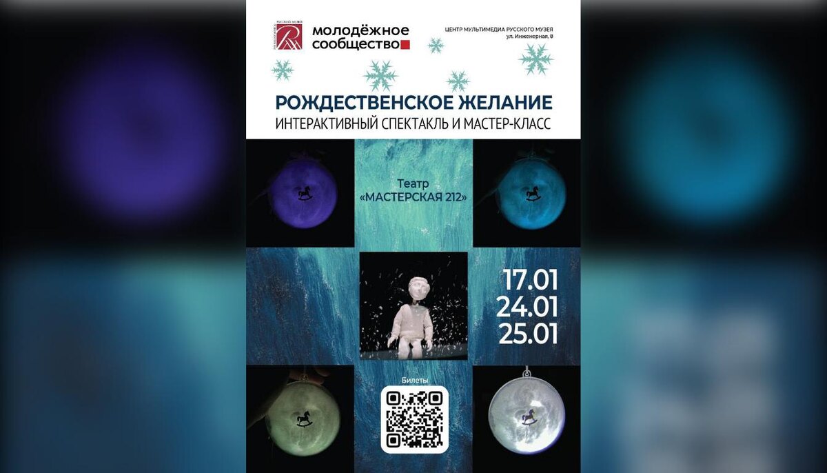 В январе Русский музей в Санкт-Петербурге представит театрально-интерактивный проект для всей семьи. Молодёжное сообщество музея совместно с театром «Мастерская 212» покажет спектакль «Рождественское желание» – «самый снежный кукольный спектакль о том, как важно не прятать чувства». Представление приурочено к новому профессиональному празднику Дню артиста, который впервые отмечается в России в этом году. После спектакля зрителей ждёт мастер-класс по созданию новогоднего шара с заветным желанием, который станет символом тепла и надежды. Как отмечают организаторы, проект соединяет театр и искусство воображения, создавая атмосферу, где каждый может поверить в чудеса. Спектакли пройдут 17, 24 и 25 января, в 16:00, в Западном павильоне Михайловского (Инженерного) замка по адресу: улица Инженерная, дом 8. Ранее сообщалось, что в Петербурге открылась выставка об эпохе Александра III.