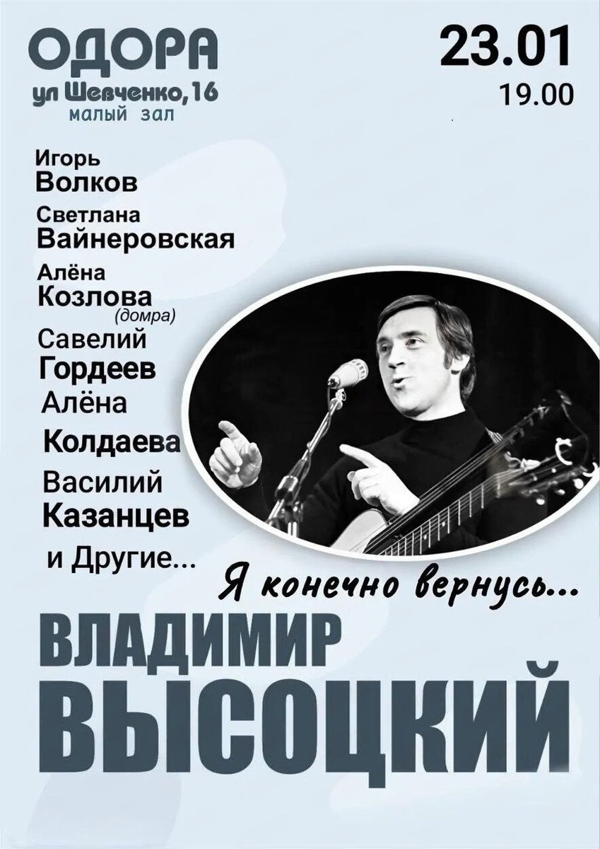 С. Высоцкого «Я конечно вернусь…» ✔ Исполнение песен и стихотворений Владимира Высоцкого ✔ Выступления авторов-исполнителей и молодых музыкантов Хабаровска ✔ Музыкальные аранжировки с акцентом на гитарное сопровождение ✔ Концерт в малом зале дома офицеров 📅 Когда: #23_января, 19:00 ⛳ Где: дом офицеров Восточного военного округа, ул. Шевченко, 16, Хабаровск 💳 Стоимость: 600 ₽ Билеты 👉 Афиша Хабаровска. Куда сходить, экскурсии