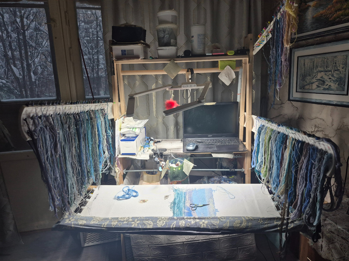 Всем вышивающим людям приветик. Есть у нас традиция. Каждый год мы с друзьями..., ой, не то... Каждый день мы садимся где-то в глубинах своих квартир, берём в руки иглу, нитки, канву, схему и кладем свои 10 - 20 - 50, а может больше - крестиков, полукрестиков, блендов, петитов, фрузелков, бэкстича, мет-нити, выкладной нити, накладной нити, такой нити, сякой-то нити, какой-то матери нити, бисером, кисточкой, печатным, непечатным, сорь задумался..., в опчем вышиваем что-то или делаем вид, или строим планы, или... Понесло Остапа плин...😁 Короче. Вот моё рабочее место. В комнате стоит вечный дРЫгатель, место идей и релакса. Тут как-то в комменте сказали, кошечки оШень не хватает насЯльника...😂 Ну да, думаю, кошечки. Ещё лучше молодой и игривой. Но если вдруг и случится такое (в чем сумлеваюсь), т к сколько их было понимания не было и решит она тут навести свой порядок, то жить ей останется два понедельника, ибо я обнулю все 9 жизней!😎 Как проходит мой день выш-релакса? Ну как он проход