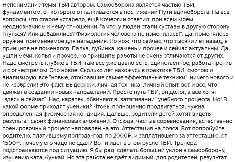 Если самооборона условно, делится, на психологическую, физическую, правовую часть, то заявление о ТБИ и самообороне – глупость. Психология, физика и правовая часть у нас и у авторов ТБИ, которые, как правило, восточные – разные! Я даже не учитываю внешние условия и изменение техники в различных внешних условиях, которые ТБИ игнорируют.