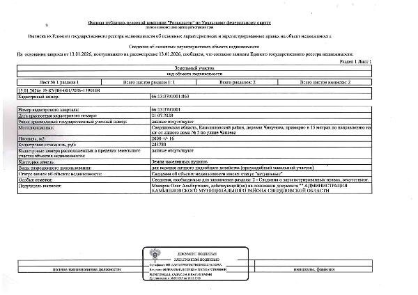 Чапаева, из категории земель – земли населенных пунктов, общей площадью 2000 кв.м., с кадастровым номером 66:13:3701001:863, разрешенный вид использования: для ведения личного подсобного хозяйства (приусадебный земельный участок). Канал: Госземля Свердловская область Область: обл Свердловская Район: м.р-н Камышловский Населенный пункт: с.п. Зареченское, д Чикунова примерно в 15 метрах по направлению на юг от жилого дома № 5 по улице Чапаева Локация: Смотреть на карте ВРИ: Для ведения личного подсобного хозяйства (приусадебный земельный участок) Кадастровый номер: 66:13:3701001:863 Кадастровая стоимость: - Вид сделки: Аренда Площадь: 2000 м² Начальная цена: - руб. Дата завершения: 13.02.2026 Подробнее: ГИС ТОРГИ #госземля #земляотгосударства #земля #земельныйучасток #земельныеторги #торги #аукцион #арендаземли #аренда #свердловскаяобласть