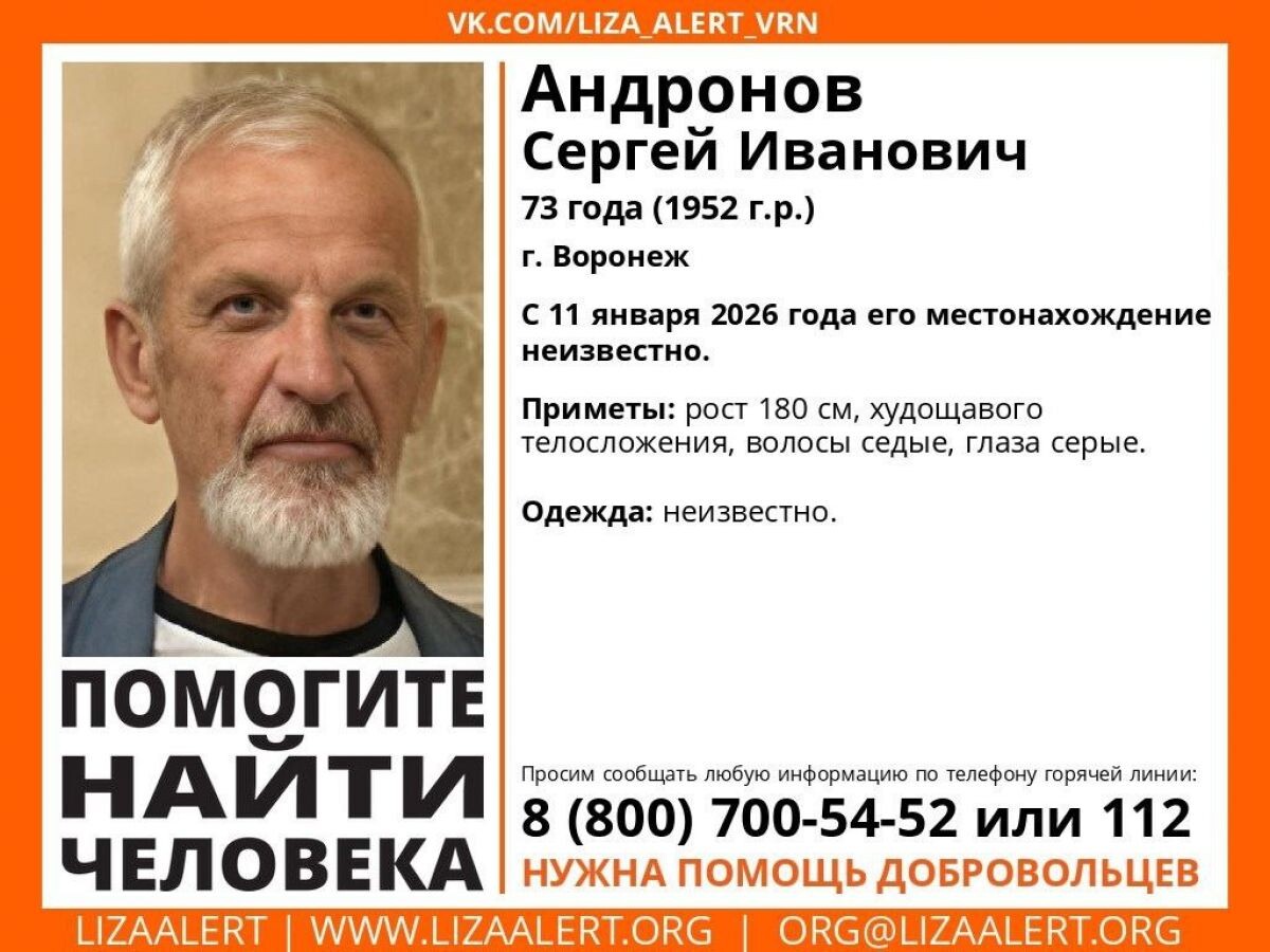 На территории Воронежской области идут поиски 73-летнего Сергея Андронова, пропавшего на исходе новогодних праздников. Об этом сообщили в поисковом отряде "Лиза Алерт". Мужчину последний раз видели 11 января, но информации о его одежде нет. Рост пропавшего - 180 см, у него седые волосы и серые глаза.