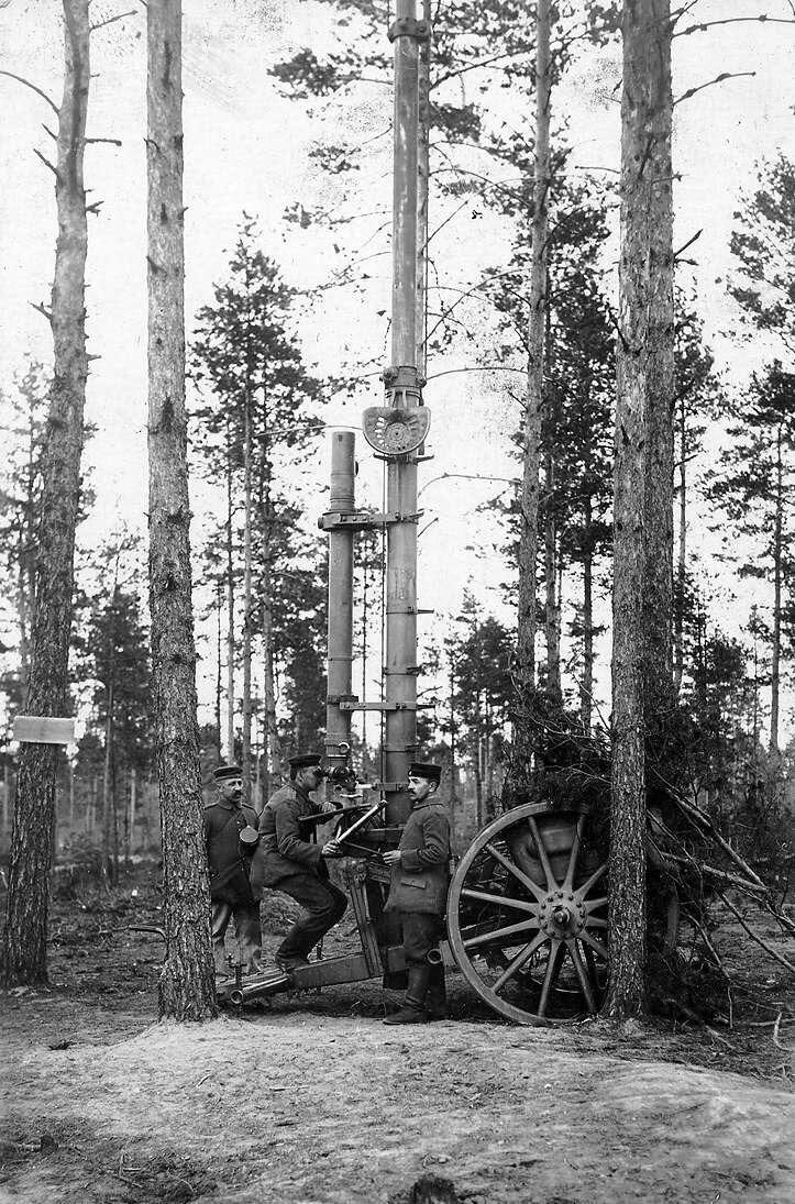 Германские солдаты осматривают местность через стереотрубу (Scherenfernrohr) на Восточном фронте, недалеко от озера Нароч, апрель 1917 года.