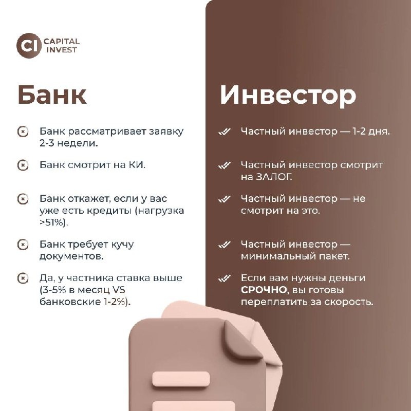 ? Вопрос, который задают часто. Почему предприниматель с плохой КИ может получить 2 млн ₽ от частного инвестора, но банк отказывает? Вот 5 причин: 1⃣ СКОРОСТЬ Банк рассматривает заявку 2-3 недели. Частный инвестор — 1-2 дня. Когда бизнесу срочно нужны деньги (тендер, контракт, кассовый разрыв) — время = деньги. 2⃣ КРЕДИТНАЯ ИСТОРИЯ Банк смотрит на КИ. Частный инвестор смотрит на ЗАЛОГ. Если недвижимость ликвидная — КИ не важна. 3⃣ КРЕДИТНАЯ НАГРУЗКА Банк откажет, если у вас уже есть кредиты (нагрузка >51%). Частный инвестор — не смотрит на это. 4⃣ СПРАВКИ О ДОХОДАХ Банк требует кучу документов. Частный инвестор — минимальный пакет. 5⃣ ПРОЦЕНТНАЯ СТАВКА Да, у частника ставка выше (3-5% в месяц VS банковские 1-2%). НО: если вам нужны деньги СРОЧНО, вы готовы переплатить за скорость. ИТОГ: Банки — для тех, кто может ждать и имеет идеальную КИ. Частные инвесторы — для тех, кому нужно БЫСТРО. Вот почему эта ниша востребована. И вот почему брокеры зарабатывают здесь серьёзные д