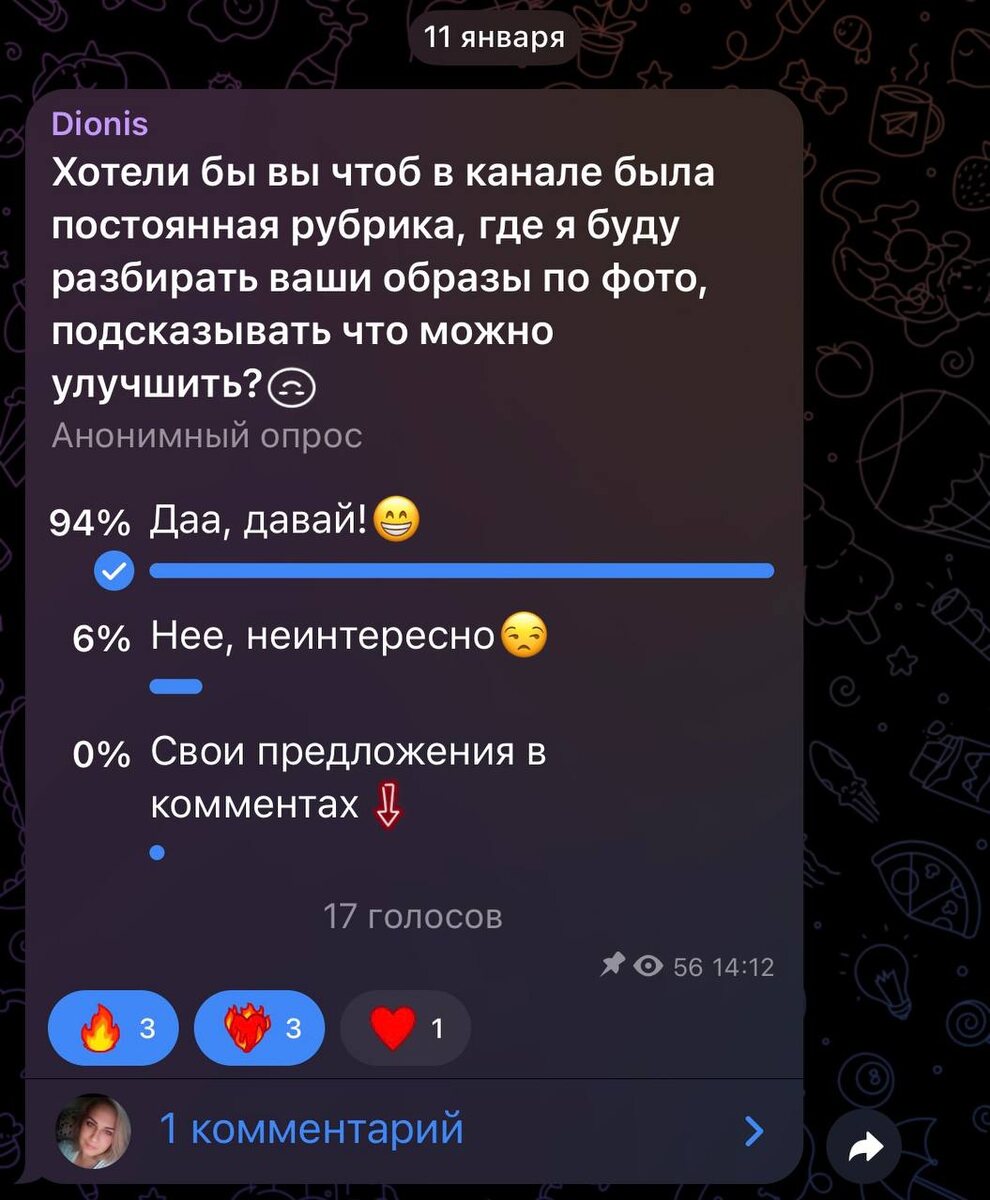 Установим несколько правил: 1. В комментариях под этим постом вы присылаете образ в полный рост, именно тот образ, в котором сомневаетесь. Если хотите просто поделиться образом, без разбора - подписывайте «не для разбора» 2. Я случайно выберу 5 образов и в течение пары дней покажу что я бы изменил, с переделанными вариантами 3. Можно присылать несколько образов, но пожалуйста одним сообщением 4. Если отправляете образ на разбор, то вы автоматически не против получить обратную связь, даже если она вам не понравится. И соглашаетесь на размещение и публикацию мной вашего образа, изображения, фотографии в различных моих социальных сетях и презентациях. Обнял, поцеловал😘 Dionis