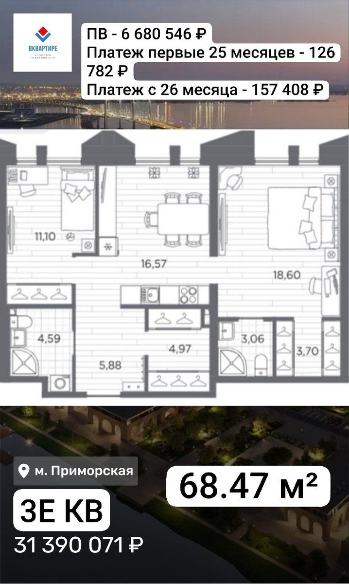 🏡 🏞️ Приморская, 10 минут транспортом 💰 Расчет стоимости по семейной ипотеке от застройщика: ✅ Стоимость квартиры с удорожанием - 33 236 546 ₽ Первоначальный взнос (ПВ) - 6 680 546 ₽ Ставка в начале - 4% Действие ставки, месяцы - 25 Последующая ставка - 6% Срок ипотеки, лет - 30 Платеж первые 25 месяцев - 126 782 ₽ Платеж с 26-го месяца - 157 408 ₽ 📍 Описание объекта недвижимости В живописном историческом районе, вдоль живописной набережной, появится новый жилкомплекс бизнес-класса. Проект предусматривает строительство четырех 12-этажных зданий и двух 6-этажных домов общей площадью около 3 гектаров. Из окон большинства квартир открывается великолепный панорамный вид на водные просторы Финского залива и Большой Невы. Кроме жилых помещений, проект включает создание нового общественного пространства на набережной. Это третье подобное пространство в городе и первое, которое возводится одновременно с жильём. Здесь планируется реконструкция исторических сооружений, формирование совр