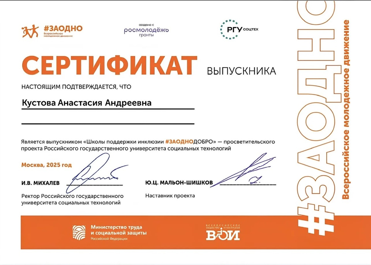 Представительницы СКФУ – студентки 4 курса Психолого-педагогического факультета Анастасия Кустова и Милана Пацюк успешно прошли онлайн-обучение в «Школе поддержки инклюзии #Заодно.Добро», организованной Российским государственным университетом социальных технологий (РГУ СоцТех). И пройдя итоговый тест, получили сертификат. Что такое «Школа поддержки инклюзии #Заодно.Добро»? Это масштабный образовательный проект, нацеленный на: - формирование компетенций в сфере инклюзивного взаимодействия; - развитие навыков сопровождения людей с инвалидностью и ограниченными возможностями здоровья (ОВЗ); - популяризацию принципов инклюзии в образовательной и социальной среде. Программа включала теоретические модули по основам инклюзии, права и доступной среды. Студентки СКФУ прошли интенсивный курс, в ходе которого: - освоили современные методики инклюзивного взаимодействия; - научились разрабатывать адаптивные решения для людей с разными потребностями; - отработали навыки командной работы и социально