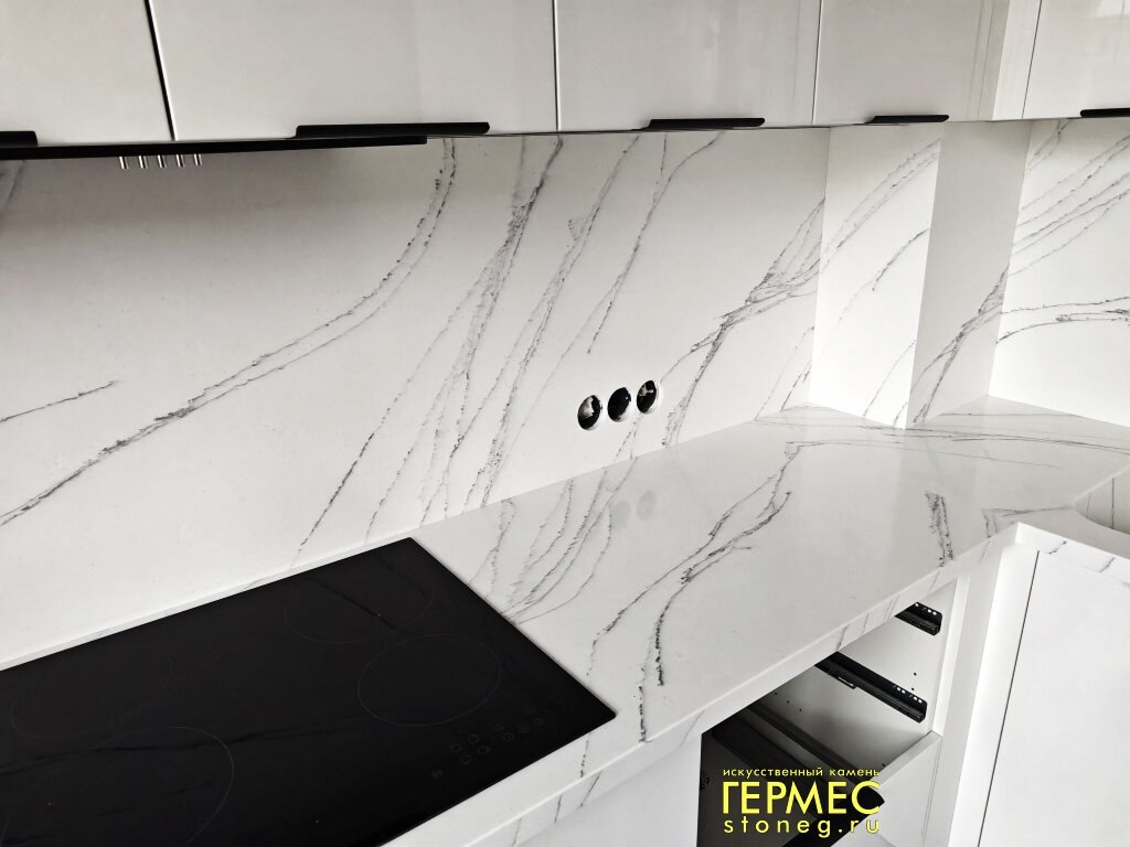 Кухонная столешница со стеновыми панелями и интегрированной мойкой из искусственного камня Grandex C-801 Arezzo Creavice белого цвета с мраморной текстурой. - Форма столешницы: угловая, г-образная, нестандартная. - Размеры: 2681х1570х605 мм. - Толщина: 38 мм. Подгиб: да. Кромка: радиусная. - Кухонная мойка: интегрированная из искусственного камня модель R500k. Размеры: 425х450 мм. Сливное отверстие: с краю. Глубина чаши: 205 мм. Стеновые панели, кухонный фартук, размеры: 2331х603, 1328х603, 242х603, 350х603 мм. Толщина: 12 мм. 👉🏻 Расчёт стоимости проектов и заказ изделий: ☎ 8 (812) 336-34-22, 👉🏻 stoneg.ru/rasschitat-stoimost-proyekta https://dzen.ru/id/5f5b6f7c3d4e5b604091de0c