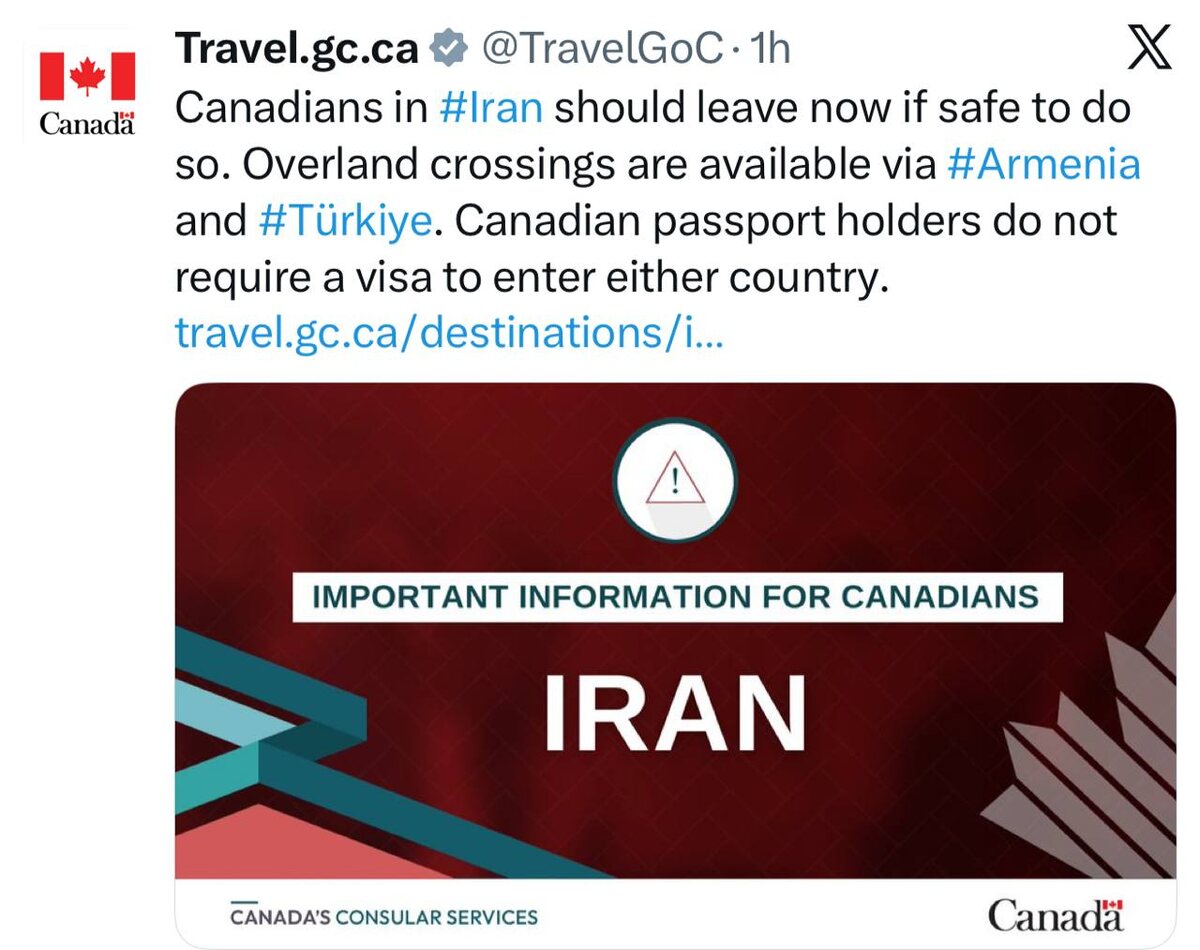⚡️Канада официально призвала канадцев немедленно покинуть Иран через наземные переходы с Турцией и Арменией