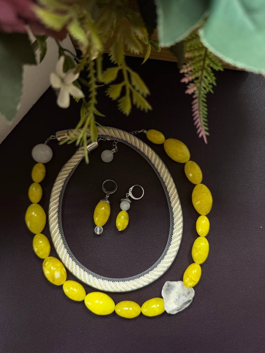 🌞 Жёлтые бусины в этом колье — как сияние весеннего солнца: теплые, живые, приносящие радость, за которую украшение хочется рассматривать ближе. Цвет не кричит, а светится — и именно поэтому украшения выглядит дорого и очень стильно. Серьги поддерживают ритм: вытянутая форма, баланс цвета и прозрачных деталей, ничего лишнего. Если хочется добавить образу тепла, света и характера — это правильный вариант.🌼 Колье 8500 Серьги 3000 ✨Нажмите для заказа ✉️ Нажмите чтобы задать вопрос