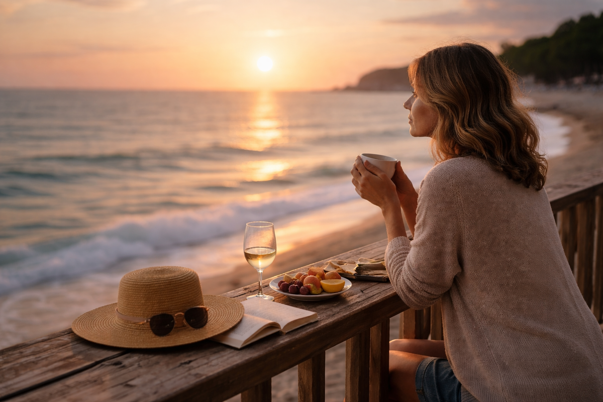Платье цвета тёплого молока, которое я всё лето берегла «на потом», купальник, который наконец-то сел на меня без этого вечного «ну терпимо», крем от солнца с запахом кокоса (смешно, да? я до сих пор верю, что запах может заранее обещать счастье), и тонкую книжку в мягкой обложке — чтобы читать на шезлонге и не думать ни о чём, кроме того, как лениво перелистываются страницы.