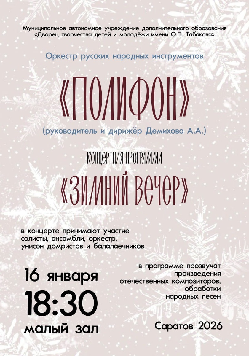 !) Приглашаем всех в эту пятницу, 16 января на коцнерт нашего коллектива! В этот зимний вечер вы услышите произведения отечественных композиторов, музыку XX века, обработки народных песен. На сцене – лауреат всероссийских конкурсов, оркестр русских народных инструментов "Полифон" ДТДиМ им. О.П. Табакова 🎶 В концерте принимают участие – оркестр русских народных инструментов, трио домристов и дуэт балалаечников, солирующая гитара, а наши самые младшие учащиеся выступят в большом унисоне домристов и балалаечников! Вход свободный, наши музыканты будут рады всем) Ждём вас 16 января в 18:30 в Малом зале Дворца творчества детей и молодёжи имени О.П. Табакова (Театральная пл., 13) ✨