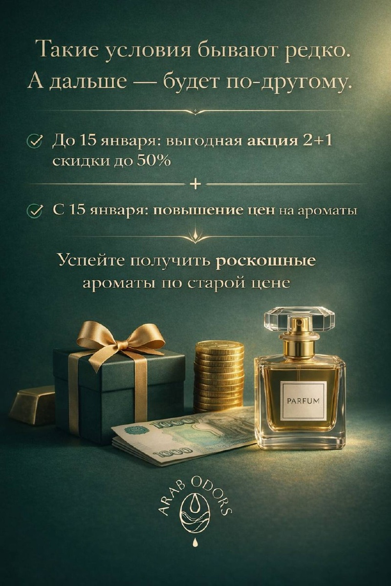 А дальше — будет по-другому. Мы всегда старались держать честные и комфортные цены. Долгое время — несмотря на рост закупочных цен, логистики и обязательных расходов — мы не меняли стоимость. Но рынок меняется. И мы честно предупреждаем вас заранее. С 16 января в Arab Odors будет обновление цен — ориентировочно +10–15%. Без удешевлений. Без компромиссов по качеству. Чтобы сохранить тот уровень ароматов, к которому вы привыкли. 💚 Именно поэтому сейчас — самый выгодный момент. До 15 января включительно действуют: — выгодная акция 2+1 — скидки до 50% — подарочные форматы — бесплатная доставка при заказе от 5 000 ₽ Как это работает: ▪️ выбираете 2 любых аромата ▪️ третий получаете в подарок (того же объёма) ▪️ платите меньше, чем обычно В каталоге — 700+ ароматов: от свежих и фруктовых до глубоких, древесных и восточных. Если вы давно хотели: — пополнить коллекцию — взять аромат «про запас» — выбрать подарок близким Сейчас — лучшее время это сделать. Мы не создаём искусственны