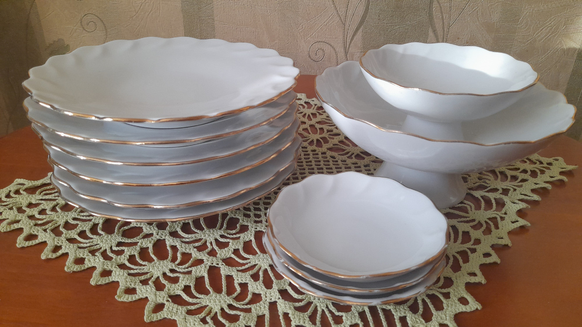 Давайте я вам покажу десертный набор, который уже более 40 лет стоит у меня в серванте и, следовательно, вполне подходит под категорию "винтаж". Я купила его в Ленинграде, куда часто ездила в командировки в 80-х годах прошлого, как это ни страшно звучит, века. Моими любимыми магазинами там были 2 магазина "Фарфор" на Невском проспекте. Продавалась там изумительная посуда Ленинградского фарфорового завода им. Ломоносова. В одном из этих магазинов я и купила вот этот набор из белоснежного фарфора с тонкой золотой отводкой. В него входили 6 десертных тарелок, 6 розеток, 2 вазочки. Правда, в настоящее время осталось только 3 розеточки. Видимо, часто пользовались. Десертные тарелки, на мой взгляд, великоваты, 18 см в диаметре. А вот обе вазочки мне очень нравятся, и находят у меня широкое применение. Большую использую, как фруктовницу, или под выпечку, печенье и т.п. А маленькую - для варенья или конфет. Но и маленькая тоже иногда служит фруктовницей, например для бэби-мандаринок или по