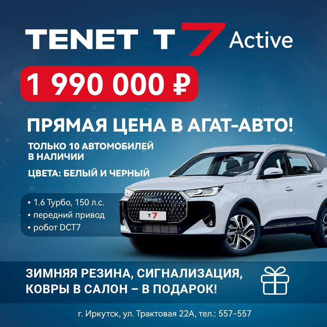 😱 Агат-Авто объявляет новогоднюю акцию до конца января 2026 года🎁 Помимо специальной цены Вы получаете подарки: ✔️Сигнализация ✔️ Ковры в салон ✔️ Зимняя резина Не время откладывать! Успейте до 31 января🙌 📍Агат-Авто на Трактовой 22А 📞 557-557