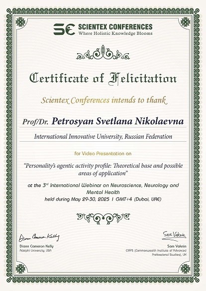 конференциях: • Доктор экономических наук, профессор Сагайдак Александр Эрнестович принял участие в Восьмом профессорском форуме (г. Москва • Доктор исторических наук, профессор Дроздов Николай Иванович принял активное участие в XX Международной научно-практической конференции «География и геоэкология на службе науки и инновационного образования, посвященной 180-летию Русского географического общества и 90-летию со дня рождения выдающегося сибирского ученого Анатолия Федоровича Ямских» (г. Красноярск) • Кандидат психологических наук, доцент Петросьян Светлана Николаевна приняла участие в 3rd International Webinar on Neuroscience, Neurology and Mental Health (Дубай, ОАЭ) • Аспирант Тельян Мишель Алиевна приняла участие в Международной научной конференц-сессии Института государственной службы и управления (ИГСУ) Президентской академии «Государственное управление и развитие России: вызовы, стратегии и перспективы» (г. Москва) #МИУ #Преподаватеи #Студенты #НашиДостижения #Наука