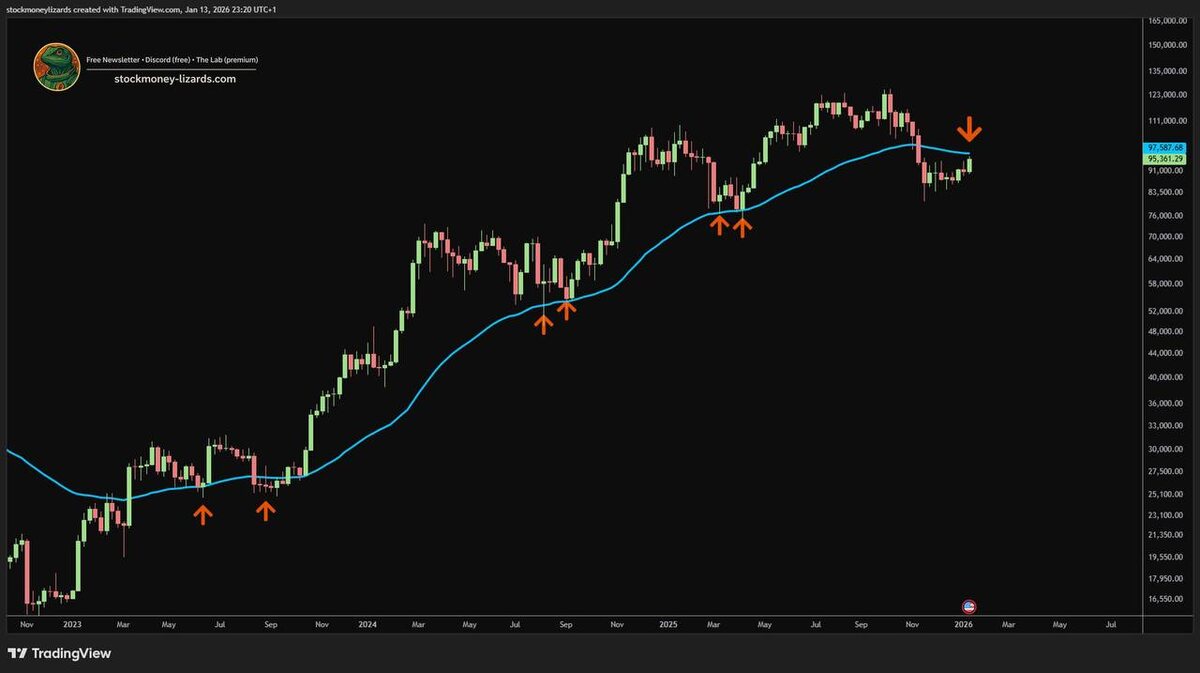 Смотрю на недельку и ловлю знакомое ощущение. Не эйфория и не страх — скорее пауза перед решением. Weekly EMA50 снова в центре внимания. В прошлые годы она работала почти как линия раздела: выше — рынок живёт, ниже — начинается другое состояние. Не сразу «медвежка», а именно смена фазы, когда ожидания меняются. Сейчас мы снова у этой линии. Цена к ней подошла, потёрлась, отскочила — и вернулась. Это не выглядит как капитуляция. И не выглядит как финальный выдох цикла. Я по-прежнему думаю, что это ещё не медвежий рынок. Скорее тот самый неудобный отрезок, где всем некомфортно: лонгам — потому что нет продолжения, шортам — потому что рынок не падает. Если гипотеза верна, рынок должен принять цену выше weekly EMA50. Не прокол, не тень, а именно жизнь над ней. Тогда разговор быстро сместится в сторону новых хаёв. Если нет — значит, цикл решил взять больше времени. Цикл всё расставит. Вопрос только — когда именно он решит, что пора. А как вы это чувствуете: этот уровень сейчас больше