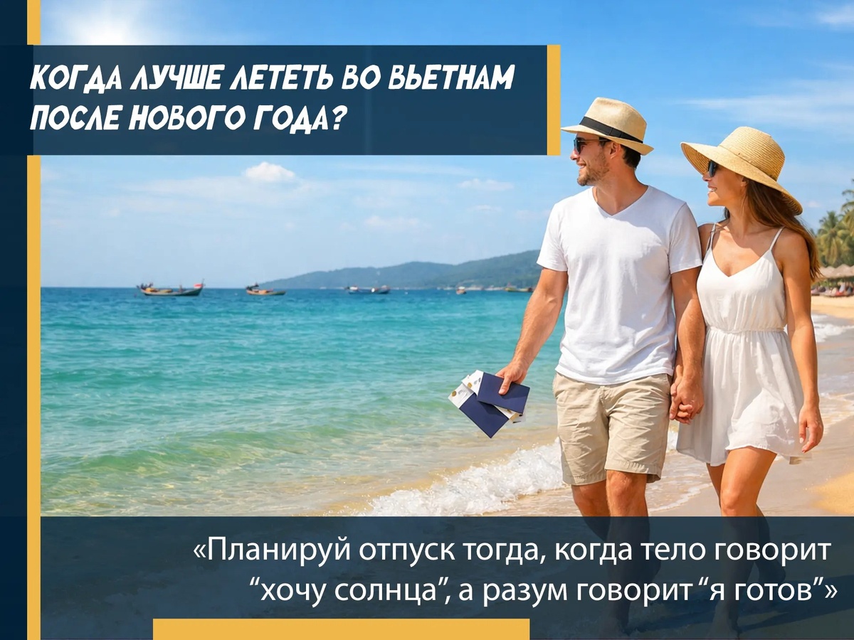 ? «Планируй отпуск тогда, когда тело говорит “хочу солнца”, а разум говорит “я готов”». — неизвестный ✅ После Нового года во Вьетнаме начинается один из лучших периодов для отдыха — стабильная сухая погода и комфортная температура воздуха около +27…+30 °C. ✅ Идеальное время для перелёта — середина января по март: именно в эти месяцы погода наиболее предсказуема, дожди минимальны, а море спокойное и тёплое. ✅ В это время особенно комфортно на юге (Фукуок, Фантьет, Муйне): здесь меньше дождей, яркое солнце и отличные пляжи. ✅ Для тех, кто любит культурные маршруты, север (Ханой, бухта Халонг) становится идеальным местом с прохладным сухим климатом для экскурсий. ✅ Бронировать билеты и отели лучше за 1,5–2 месяца до поездки — так вы поймаете лучшие цены и больше вариантов размещения. Во Вьетнаме после Нового года вас ждёт не только тепло, но и вдохновение, новые впечатления и настоящий тро... Тур1 | поиск туров → https://tur-1.ru
