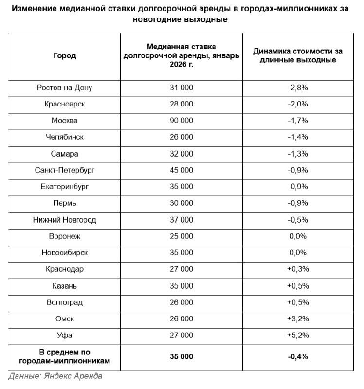 ΠΠ° Π½ΠΎΠ²ΠΎΠ³ΠΎΠ΄Π½ΠΈΠ΅ ΠΊΠ°Π½ΠΈΠΊΡΠ»Ρ ΠΌΠ΅Π΄ΠΈΠ°Π½Π½Π°Ρ ΡΡΠ°Π²ΠΊΠ° Π΄ΠΎΠ»Π³ΠΎΡΡΠΎΡΠ½ΠΎΠΉ Π°ΡΠ΅Π½Π΄Ρ Π² ΠΠΎΡΠΊΠ²Π΅ ΡΠ½ΠΈΠ·ΠΈΠ»Π°ΡΡ Π½Π° 1,7% β Π΄ΠΎ 90 ΡΡΡ. ΡΡΠ±. ΠΏΠΎ Π²ΡΠ΅ΠΌ ΡΠΈΠΏΠ°ΠΌ ΠΊΠ²Π°ΡΡΠΈΡ. ΠΠ΄Π½ΠΎΠ²ΡΠ΅ΠΌΠ΅Π½Π½ΠΎ ΠΏΡΠ΅Π΄Π»ΠΎΠΆΠ΅Π½ΠΈΠ΅ ΡΠΎΠΊΡΠ°ΡΠΈΠ»ΠΎΡΡ Π½Π° 3,3% ΠΏΠΎ ΡΡΠ°Π²Π½Π΅Π½ΠΈΡ Ρ ΠΊΠΎΠ½ΡΠΎΠΌ 2025 Π³ΠΎΠ΄Π°. β¬οΈ Π‘ΠΈΠ»ΡΠ½Π΅Π΅ Π²ΡΠ΅Π³ΠΎ Π°ΡΠ΅Π½Π΄Π° ΠΏΡΠΎΡΠ΅Π»Π° Π² Π¦ΠΠ β ΡΡΠ°Π·Ρ Π½Π° 8,8%, Π΄ΠΎ 215,3 ΡΡΡ. ΡΡΠ±. Π’Π°ΠΊΠΆΠ΅ ΡΠ½ΠΈΠΆΠ΅Π½ΠΈΠ΅ Π·Π°ΡΠΈΠΊΡΠΈΡΠΎΠ²Π°Π½ΠΎ Π² ΠΠΠ (-3,7%), Π‘ΠΠ (-2,7%) ΠΈ Π‘ΠΠΠ (-2,1%). Π ΡΡΠ΄Π΅ ΠΎΠΊΡΡΠ³ΠΎΠ² ΡΡΠ°Π²ΠΊΠΈ ΠΎΡΡΠ°Π»ΠΈΡΡ ΠΎΠΊΠΎΠ»ΠΎ Π½ΡΠ»Ρ, Π° Π² ΠΠΎΠ²ΠΎΠΉ ΠΠΎΡΠΊΠ²Π΅ ΠΈ Π‘ΠΠΠ Π΄Π°ΠΆΠ΅ ΠΏΠΎΠΊΠ°Π·Π°Π»ΠΈ Π½Π΅Π±ΠΎΠ»ΡΡΠΎΠΉ ΡΠΎΡΡ. π΅Π ΡΠ΅Π»ΠΎΠΌ ΠΏΠΎ 16 Π³ΠΎΡΠΎΠ΄Π°ΠΌ-ΠΌΠΈΠ»Π»ΠΈΠΎΠ½Π½ΠΈΠΊΠ°ΠΌ ΠΌΠ΅Π΄ΠΈΠ°Π½Π½Π°Ρ ΡΡΠ°Π²ΠΊΠ° Π·Π° ΠΏΡΠ°Π·Π΄Π½ΠΈΠΊΠΈ ΡΠ½ΠΈΠ·ΠΈΠ»Π°ΡΡ Π²ΡΠ΅Π³ΠΎ Π½Π° 0,4% β Π΄ΠΎ 35 ΡΡΡ. ΡΡΠ±. Β©οΈ Π ΠΎΠΌΠ°Π½ ΠΡΠΊΠΎΠ², ΡΡΠΊΠΎΠ²ΠΎΠ΄ΠΈΡΠ΅Π»Ρ ΡΠ΅ΡΠ²ΠΈΡΠ° Π―Π½Π΄Π΅ΠΊΡ ΠΡΠ΅Π½Π΄Π°: Π ΡΠ½ΠΎΠΊ Π°ΡΠ΅Π½Π΄Ρ Π² Π±ΠΎΠ»ΡΡΠΈΠ½ΡΡΠ²Π΅ Π³ΠΎΡΠΎΠ΄ΠΎΠ² Π² ΠΏΠ΅ΡΠ²ΠΎΠΉ Π΄Π΅ΠΊΠ°Π΄Π΅ ΡΠ½Π²Π°ΡΡ Π½Π°Ρ