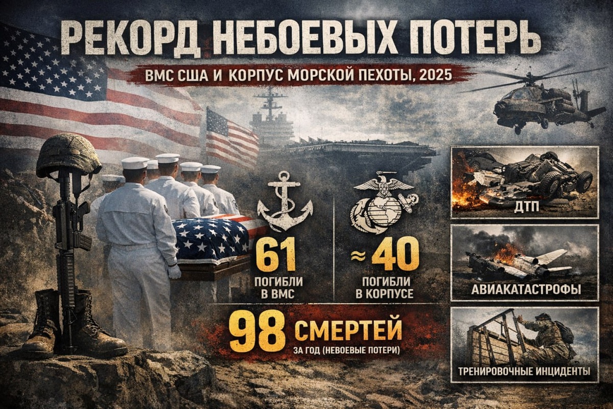 В 2025 году ВМС США и Корпус морской пехоты зафиксировали самое высокое за последние десять лет количество смертей личного состава, не связанных с боевыми действиями. Такие данные следуют из отчетов Naval Safety Command и профильных военных изданий США. Речь идет о десятилетнем антирекорде, который уже вызывает обеспокоенность внутри американского военного ведомства и ставит под сомнение эффективность действующих программ безопасности и подготовки. По совокупным данным, в 2025 финансовом году: ▪️в ВМС США зафиксирован 61 случай случайной смерти; ▪️в Корпусе морской пехоты — 40 погибших; ▪️общее число небоевых потерь приближается к 100 военнослужащим. Это худший результат с середины 2010-х годов. И это — в условиях отсутствия полномасштабных боевых операций с участием флота и морской пехоты. Структура смертей выглядит особенно показательно: ▪️дорожно-транспортные происшествия; ▪️аварии авиации во время учебных полётов; ▪️инциденты на тренировках; ▪️бытовые и рекреационные происшеств