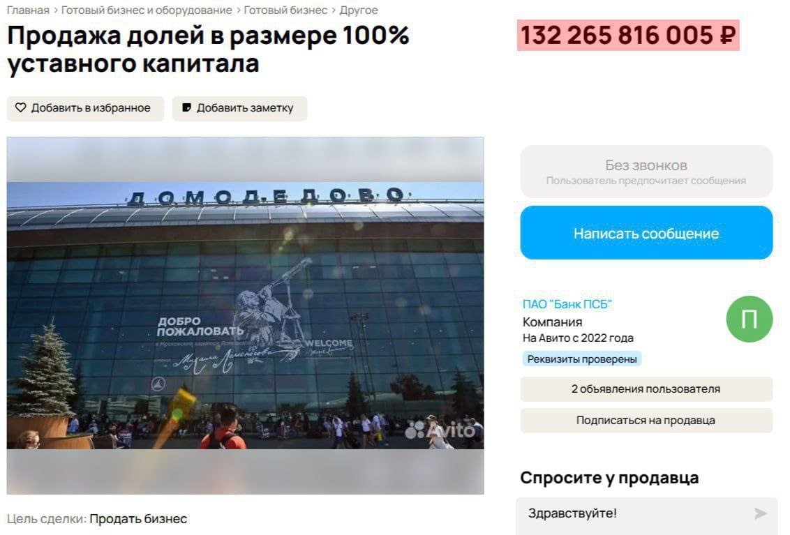Аэропорт Домодедово продают... на Авито — стартовая цена всего ₽132,2 млрд, дальше будут аукцион и торги.