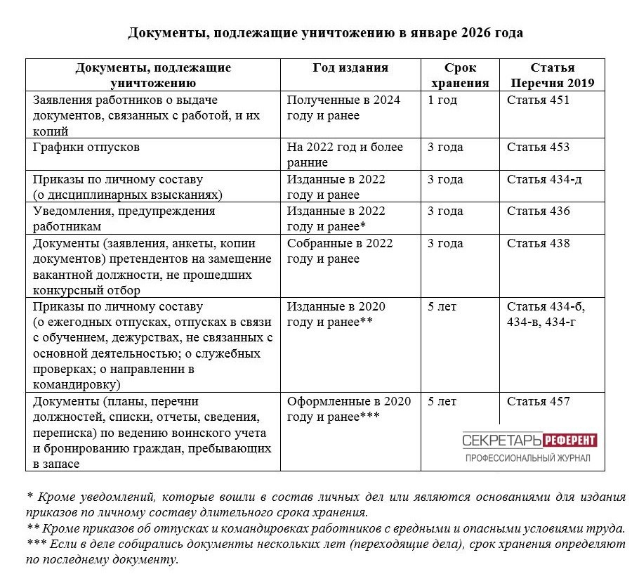 Документы, подлежащие уничтожению в январе 2026 года 1 января 2026 г. истекает срок хранения некоторых документов с небольшим сроком хранения. Они приведены в Таблице.