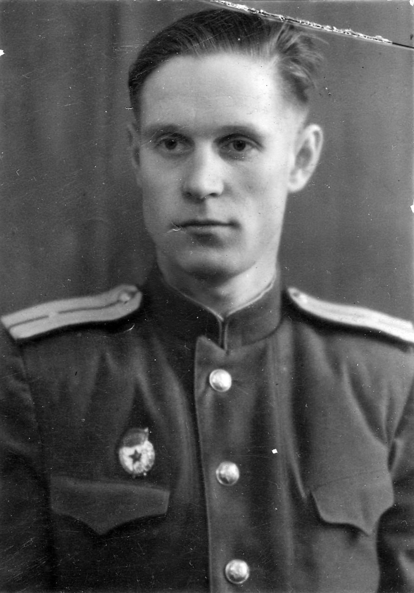 Гвардии младший лейтенант Пономарев в закрытом кителе с воротником стойкой со съемными погонами образца 1946 года.