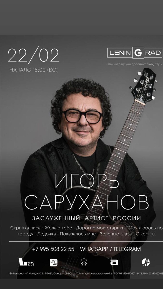 Игорь Саруханов - легендарный музыкант, композитор и поэт, Заслуженный артист России и член Союза композиторов. Его песни «Зеленые глаза», «Скрипка-лиса», «Дорогие мои старики», «Лодочка», «Желаю тебе», «Позади крутой поворот», «Показалось мне», «С кем ты» и многие другие до сих пор остаются образцами искренней мелодичности и настоящими хитами, глубоко любимыми всеми поколениями меломанов. Игорь Саруханов: «Музыкальная программа будет состоять, конечно же, из лучших и самых популярных композиций разных лет. В этот вечер мы, конечно же, и споём вместе самые ваши любимые песни, и обязательно потанцуем. Очень жду нашей встречи!» Поддержка: +7 995 508 22 55 WhatsApp / Telegram