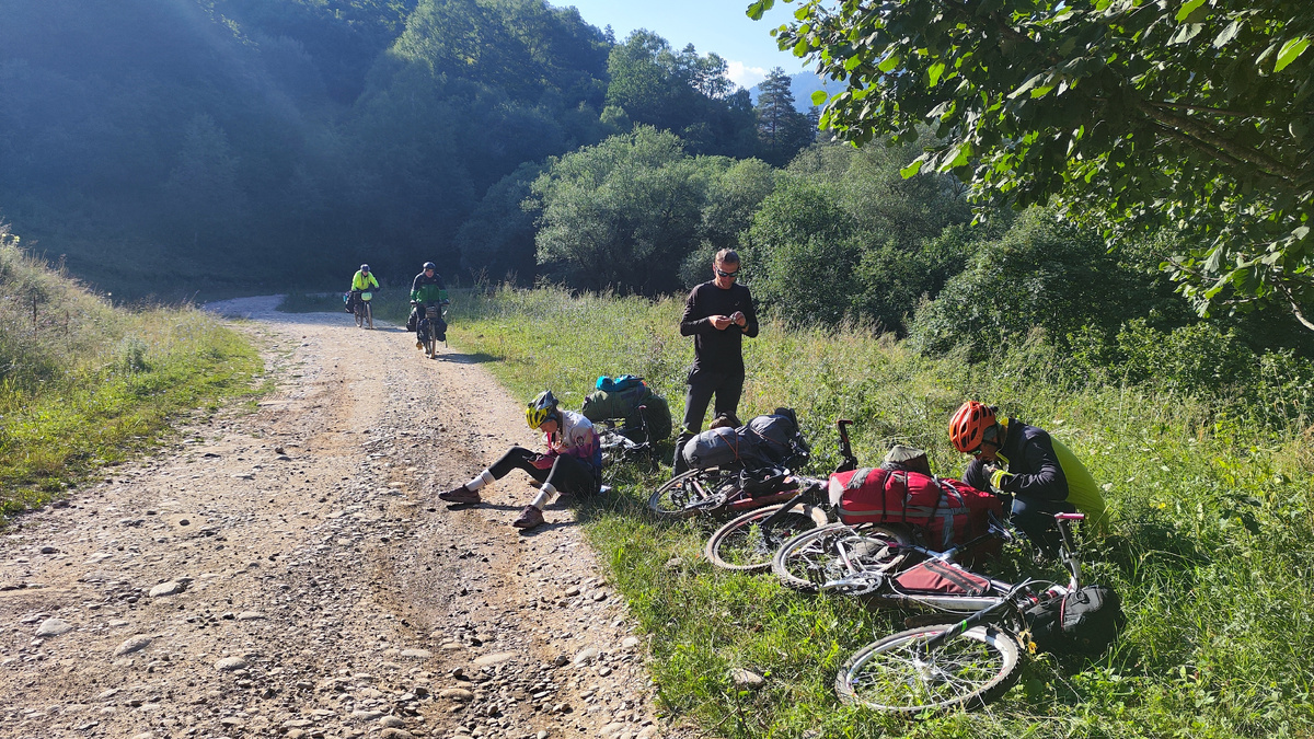 Сегодня нам нужно проехать от нашей стоянки в ущелье Худеса куда-нибудь поближе к Черкесску. Пятнадцать километров остаётся нам по неплохой каменистой дороге, а затем выйдем на асфальт и будем ехать вдоль Кубани.