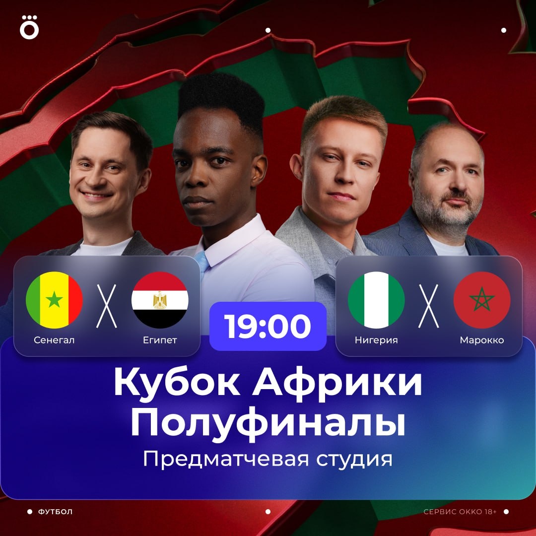 ! 🔜 Программа следующая. Запоминай: Сначала Кирилл Пупшев, Лионель Абба, Владислав Прусов и Николай Саприн соберутся в студии, чтобы как следует подготовить тебя к встречам Сенегал – Египет и Нигерия – Марокко. После первого матча Васант Балан и Михаил Лихачев сменят Лео и Влада и уже в таком составе после финальных свистков все обсудят итоги полуфиналов. Подключайся в 19:00 в сервисе Okko! 💪🏻 https://okko.tv/s/wks