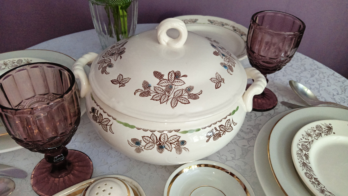 Очаровательная барышня супница от производства Завода имени Калинина, в если проще - ЗиК, с прелестными ягодками ежевики. Так, кстати, назывался весь сервиз "Ежевика", куда входили не только тарелки самых разных мастей, но и салатник, спецовники и соусники, блюда, рыбницы. Добротный сервиз из 34 предметов.
