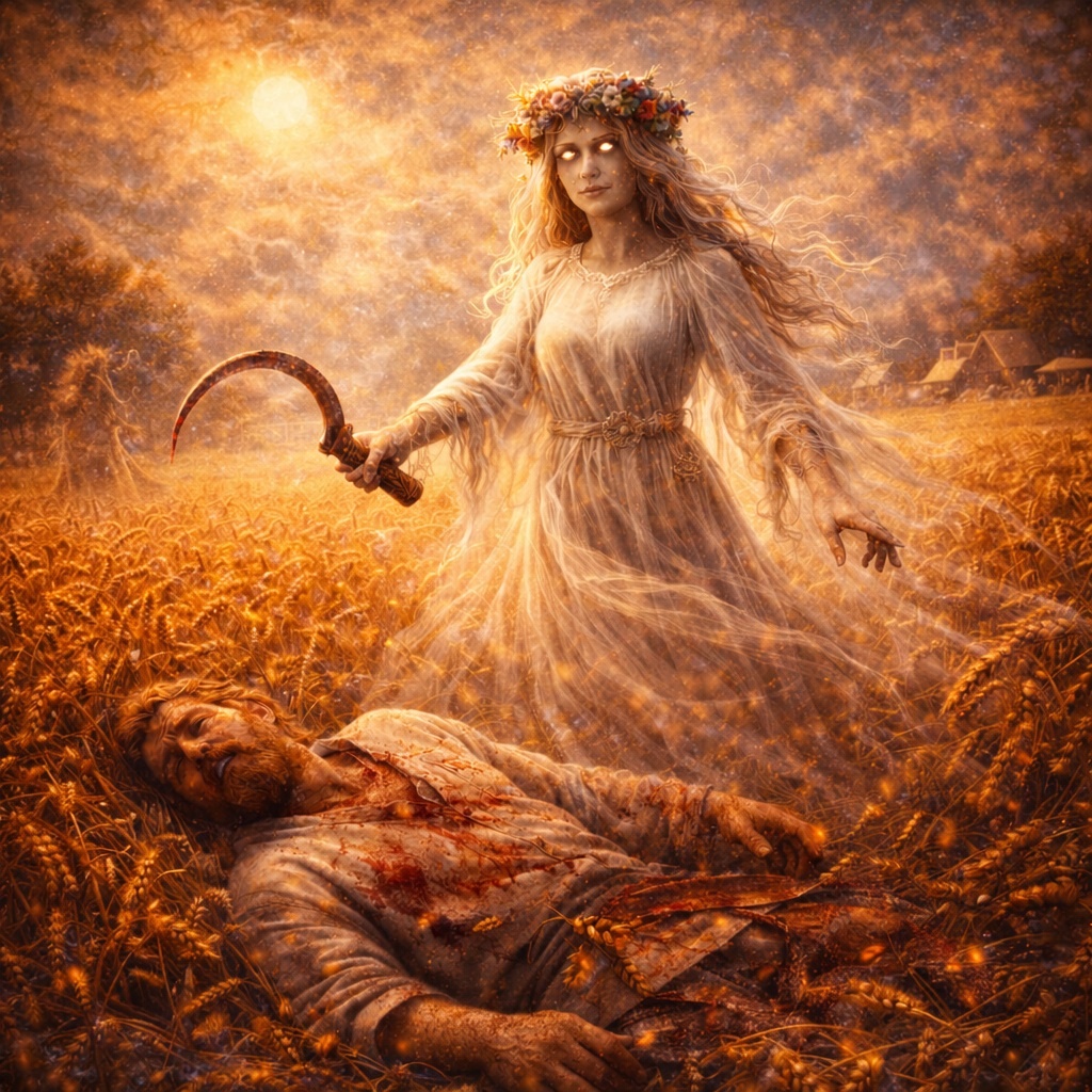 Серп в руках Полудницы — не оружие, а инструмент завершения. Он не режет человека — он напоминает: всё, что растёт, будет срезано.