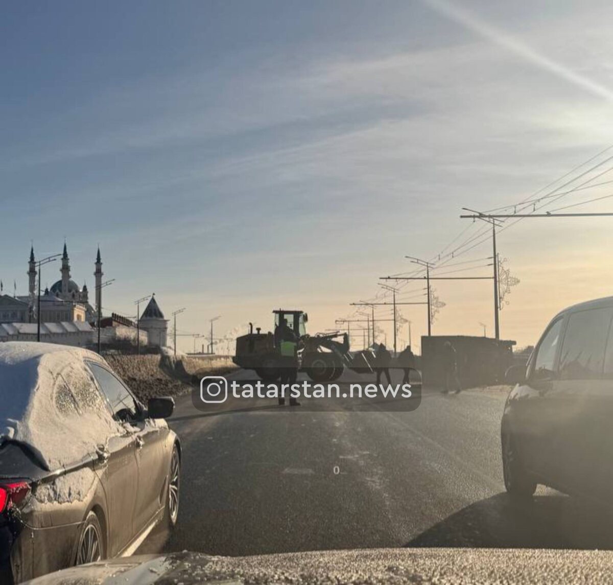 На Кремлевской дамбе произошла авария. Предварительно, на большой скорости перевернулся грузовой автомобиль.