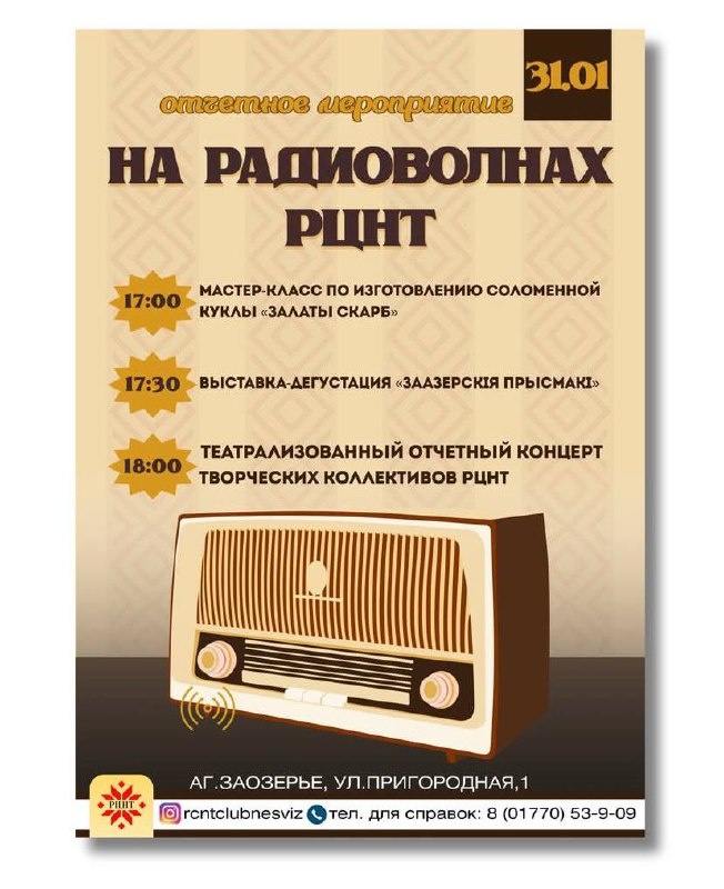 «На радиоволнах РЦНТ»📻 Вас ждет калейдоскоп талантов, яркие выступления и море позитивных эмоций! Приходите поддержать наших артистов и провести незабываемый вечер✨ 31 января | суббота СПРАВКИ ПО ТЕЛ.: 8 (01770) 53-9-09