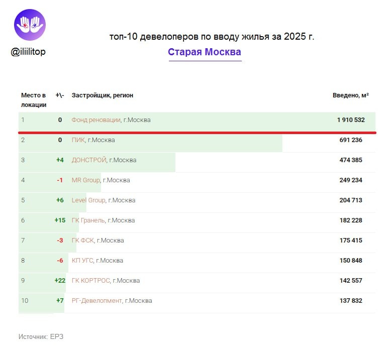 Фонд Реновации. По версии ЕРЗ, город обошёл любого коммерческого застроя в разы У Фонда 1,9 млн сданных метров в МКД. И в следующие годы будет ещё интереснее. Ибо в планах 2026-2028 - построить аж 9 млн м2 жилья. Есесьно, солидная доля этого добра пойдёт в рыночную продажу. Через Москварталы Скрытая ранее для многих "рыночная петарда" - скоро бахнет @iliilitop