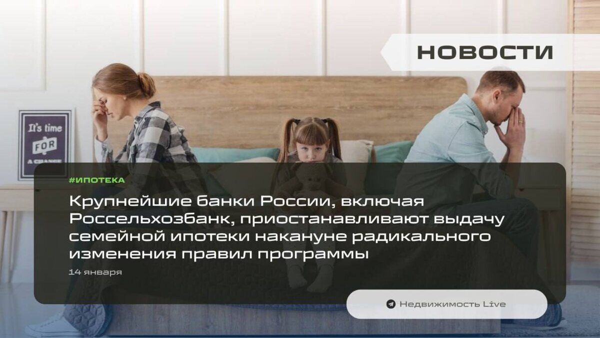 ⚡️ Крупнейшие банки России, включая Россельхозбанк, приостанавливают выдачу семейной ипотеки накануне радикального изменения правил