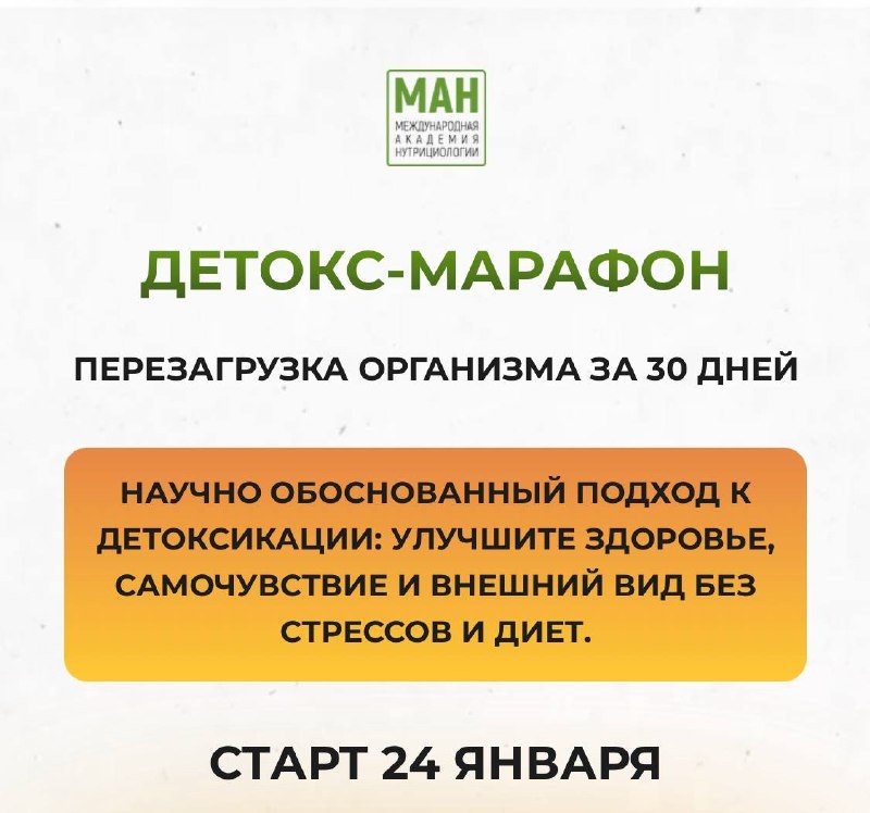 ». Это не «детокс на соках», а продуманная система, где каждый шаг логичен и безопасен. Что вас ждёт на марафоне: 🌱Четкий план детокса с плавным входом и выходом, чтобы процесс был легким и приносил видимый результат. 🌱 Простые и вкусные рецепты - сбалансированные блюда для комфортной разгрузки организма, которые легко приготовить. 🌱 Рекомендации по БАДам - добавки для усиления очищения, поддержки печени и нормализации кишечной флоры. 🌱 Ежедневные посты и подкасты с полезной информацией о питании, здоровье и мотивации. 🌱 Ежедневная поддержка и мотивация в чате — ответы на вопросы, проверка отчетов по питанию и рекомендации от куратора. 🌱 Викторины и конкурсы с призами, чтобы закрепить знания и сделать процесс увлекательным. 🌱 Упражнения для разгона лимфы, чтобы улучшить циркуляцию и ускорить процесс очищения. 📍Старт марафона — 24 января Ждём вас среди участников. Присоединяйтесь 👉 ИДУ НА МАРАФОН