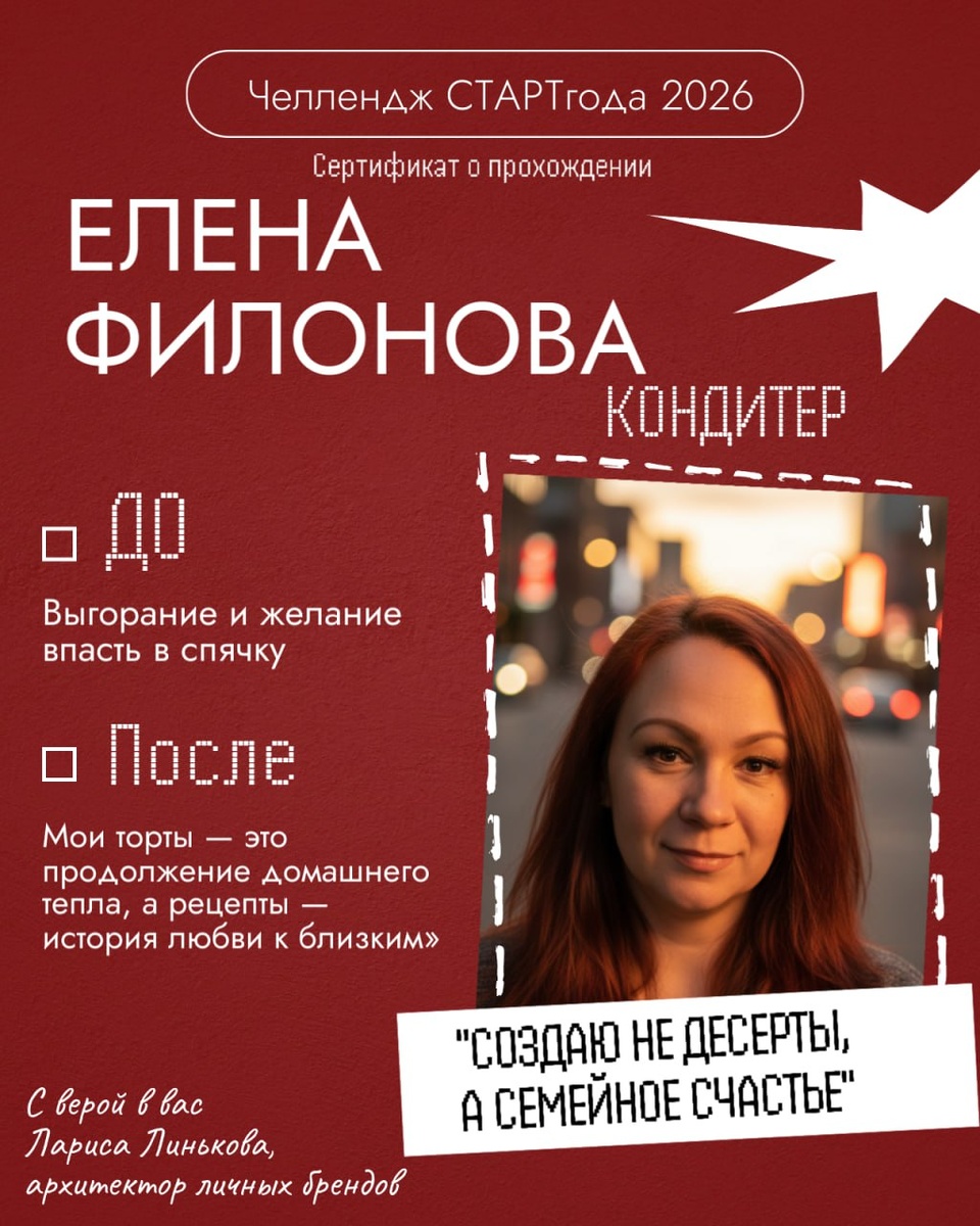 🔍 БЫЛО: «Просто пеку торты. И хочется бросить» Елена — талантливый кондитер. Но её честная фраза на старте: «Я выгорела. Кондитерство стало просто работой». Её бренд звучал избито: «торты на заказ» 💡 ПОВОРОТ: Челлендж «Старт года» по методу «Доброе Имя» Он помог ей осознать, что её главные клиенты — не «все», а женщины, создающие семейный уют. Её глубинная ценность — домашнее тепло и традиции. Кондитерство стало продолжением этой ценности. 🚀 СТАЛО: «Я создаю вкусное семейное счастье» 🎬Удивительно, что первый же ролик, где она с мужем просто едят торт и смеются, — взорвал охваты. Потому что люди увидели не товар, а ту самую ценность — вживую. ✨ МОЙ ИНСАЙТ: Когда дело становится продолжением твоих ценностей появляется энергия и подлинность, которая притягивает своих людей. Это и есть суть перехода от «специалиста» к «Автору». А какая ваша глубинная ценность могла бы стать сердцем вашего бренда? #кейс Как вам история Елены?