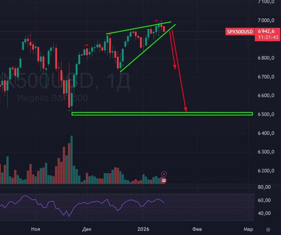 📈 Индекс S&P500 🟢 В прошлом посте я указывал на наличие трех медвежьих поглощений в индексе, после чего все равно ждал индекс к 7000, т.к. обычно рынки тащат вверх к праздникам. Праздники позади, до 7000 немного не дотянули. 🟢Сейчас у нас клин! При условии того, что индекс имеет медвежьи сигналы, а так же сегодня суд в США по пошлинам, предполагаю, что сегодня может состояться выход вниз. 🚗 Графики предвосхищаются события? скоро узнаем! Жду S&P500 ниже - 6720, 6500. В случае, если начнутся рецессионные процессы, то ниже есть цели, но об этом еще рано говорить. #sp500 #nasdaq #spy #spx #spyf #рыноксша #сиплый #прогноз #макро #bogdanoffinvest $SFH6 $SFM6 $NAH6 $NAM6